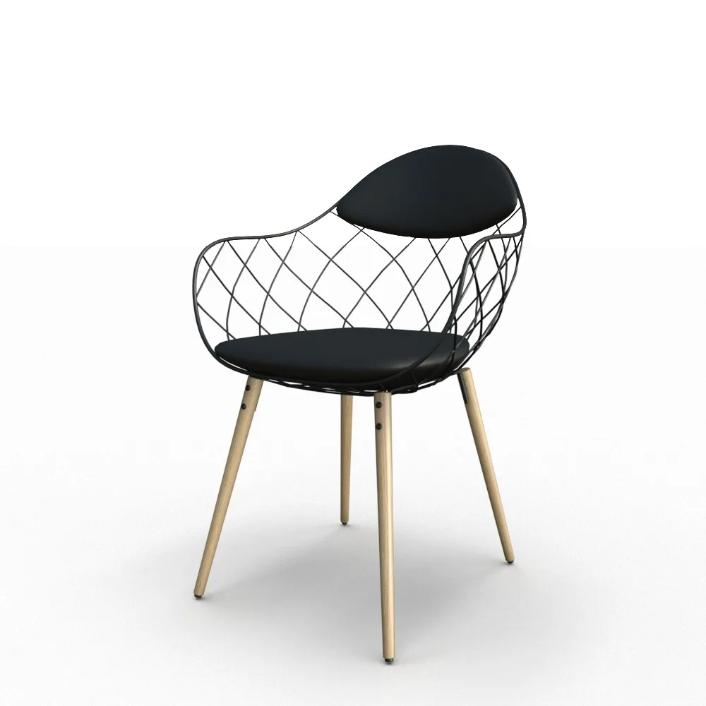 Un dossier et une assise rembourrée en velours pour le confort, une structure et des accoudoirs en métal pour la modernité et des pieds en bois pour la chaleur.